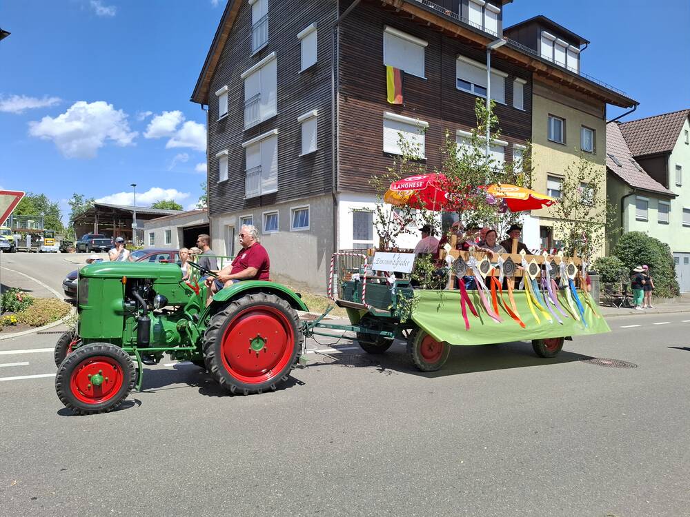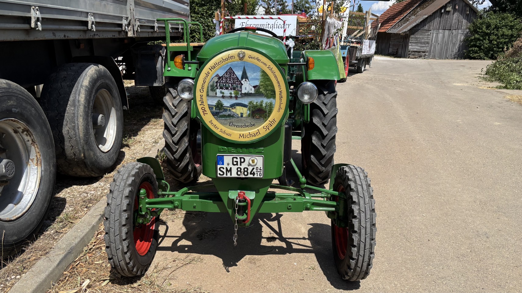 Wieso durfte ich eigentlich nicht im Ehrenmitglieder-Traktor mitfahren? Meine Ehrenscheibe vom Vereinspokalschießen ist doch auch dabeigewesen!